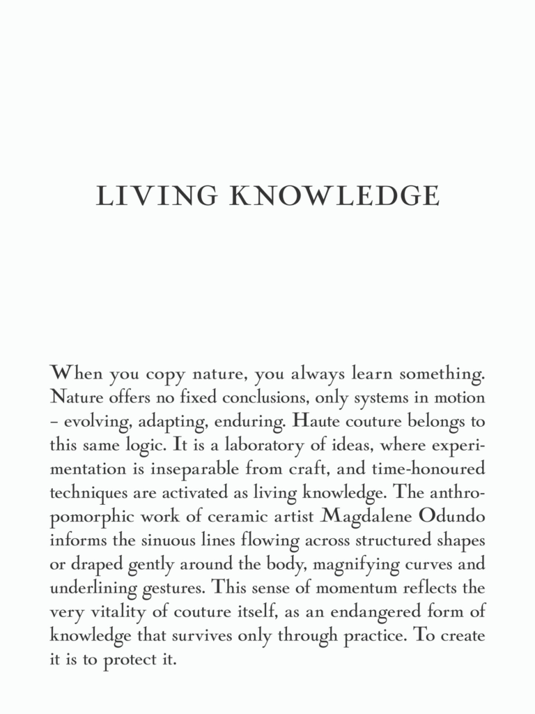 After the runway presentation, the show space was set to become an exhibition titled Grammar and Form, placing pieces from the couture collection alongside archival works by Christian Dior and ceramic pieces by Magdalene Odundo.