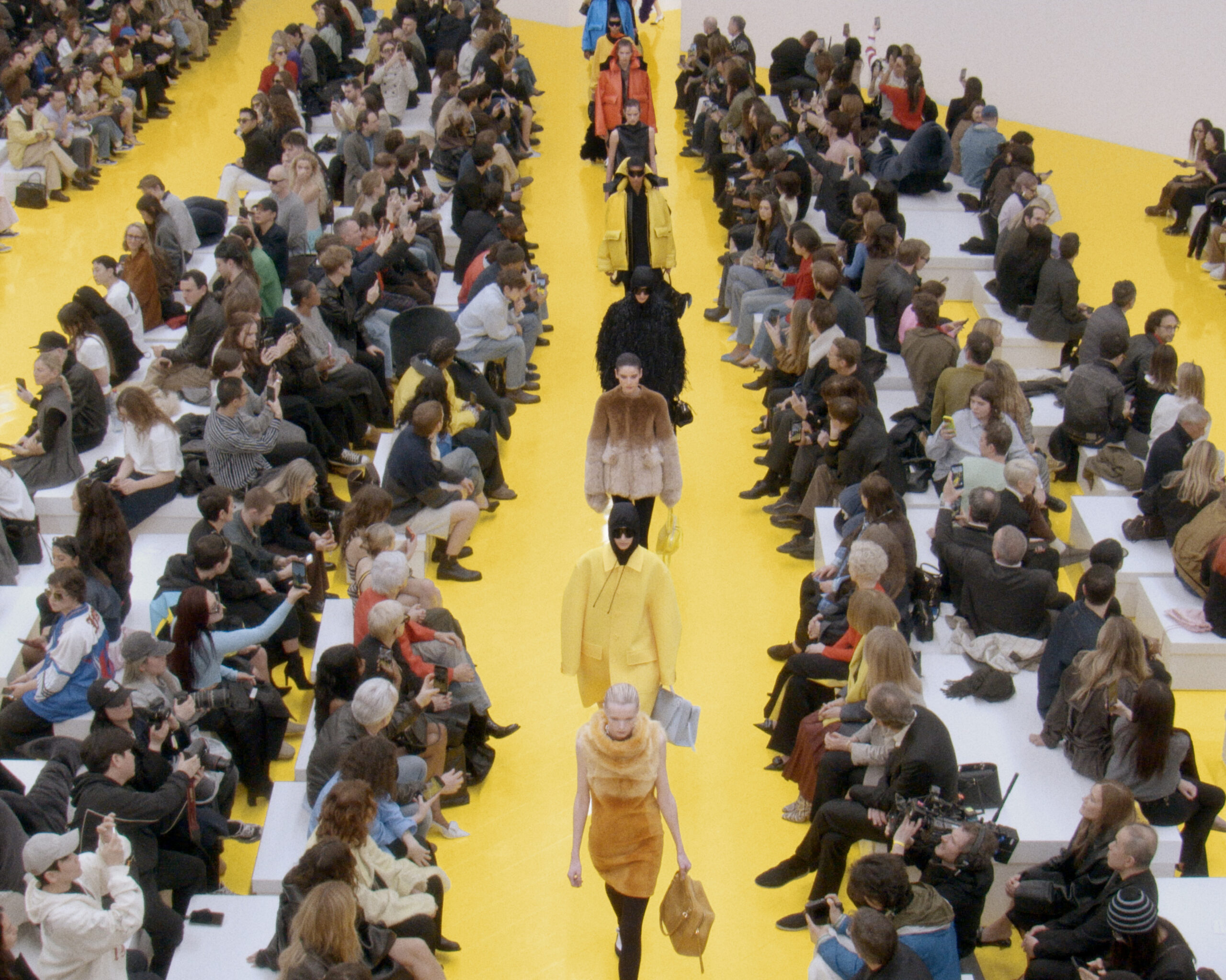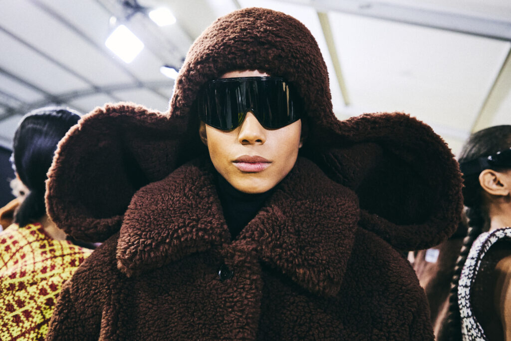 For the Fall Winter 2026 show, von Bonin’s upholstered animal sculptures occupy the space as both spectators and installations. Positioned on oversized shoeboxes, they act as companionable onlookers while also becoming part of the spectacle itself.