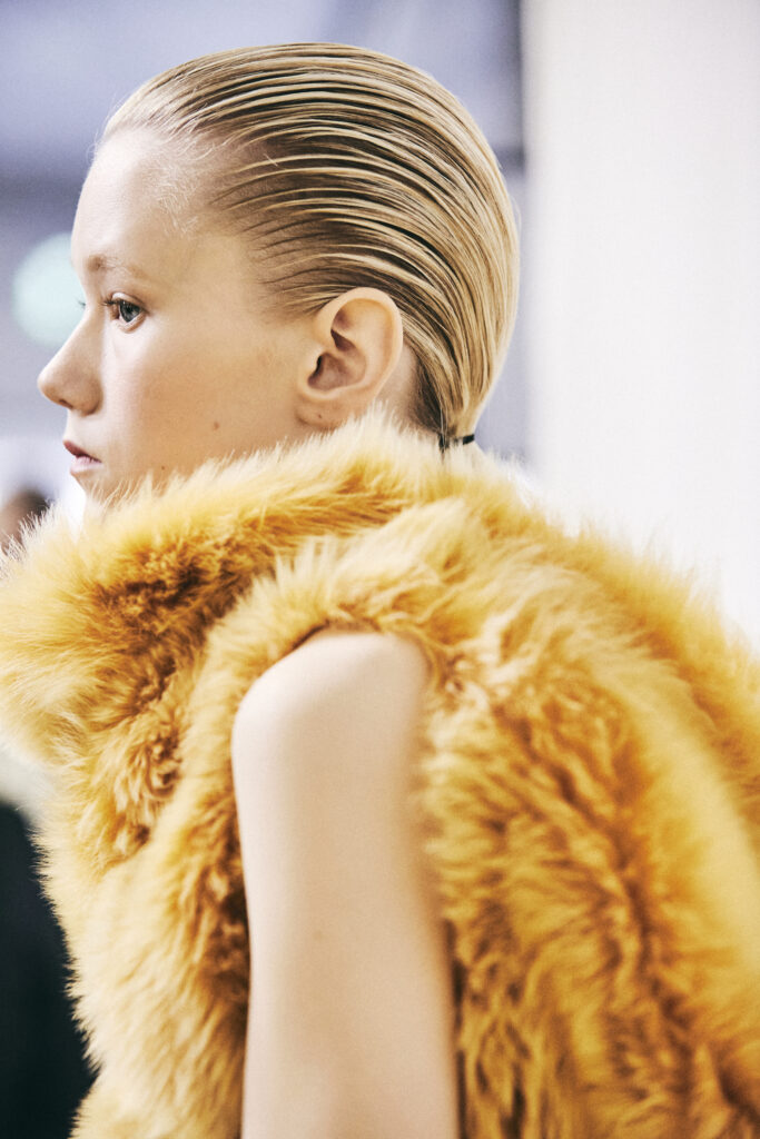 Elsewhere, texture drives the collection forward. Bouclé coats are crafted from looped lacquered leather, while tartan sweaters and dresses are knitted from ultra-thin leather yarn. Pastel-dyed shearling coats and corduroy trousers are finished with gradient trims, drawing subtle parallels to poodle grooming techniques.