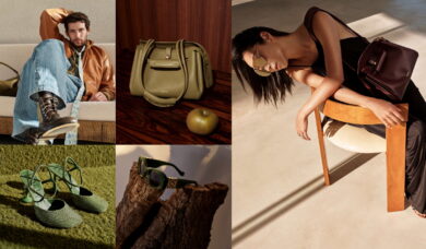 This season’s shoes carry the same tactile richness. The new Pebble line, marked by a gold Anagram pebble detail, includes ballerinas and mules in nappa lambskin. The Rio slippers, handcrafted over two days with hand-embroidered raffia, bridge city and beachwear with ease. And for those who want their bag to channel a biker jacket’s swagger, the Puzzle Biker arrives in shiny calfskin, detailed with hardware and double-stitch paneling.