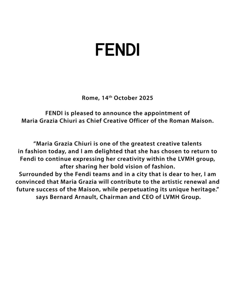 “Surrounded by the Fendi teams and in a city that is dear to her, I am convinced that Maria Grazia will contribute to the artistic renewal and future success of the Maison, while perpetuating its unique heritage.”