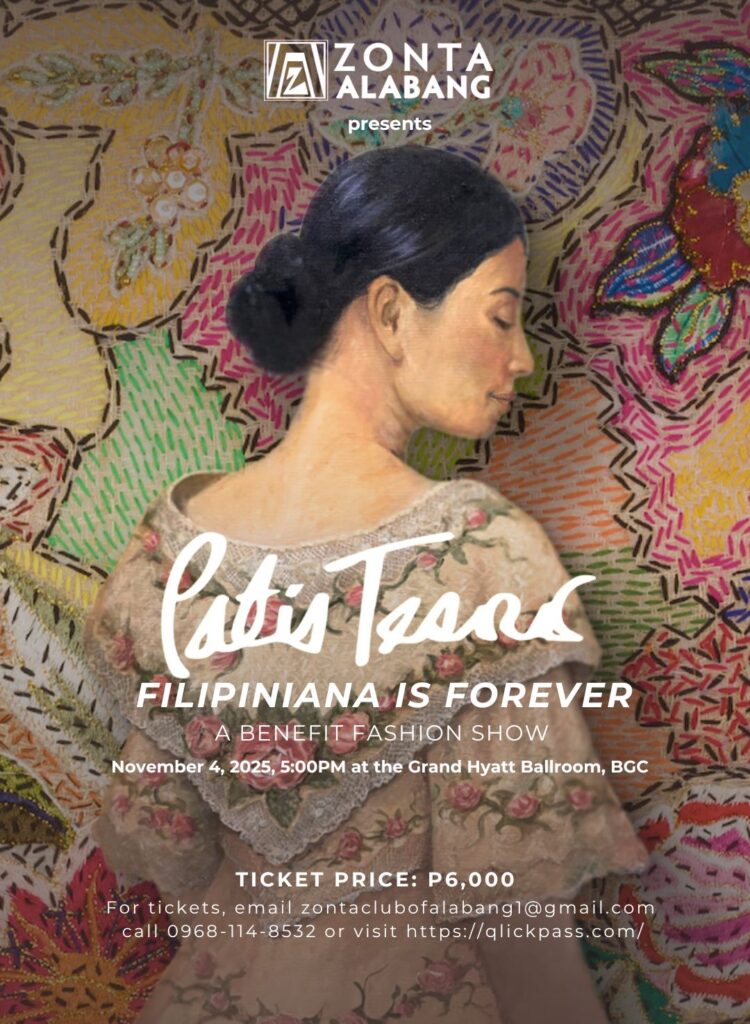Patis Tesoro’s Filipiniana is Forever is a benefit show presented by the Zonta Club of Alabang. It will happen on November 4, 2025, at the Grand Ballroom of the Hyatt BGC. Tickets are available via https://qlickpass.com. For inquiries, email zontaclubofalabang1@gmail.com.