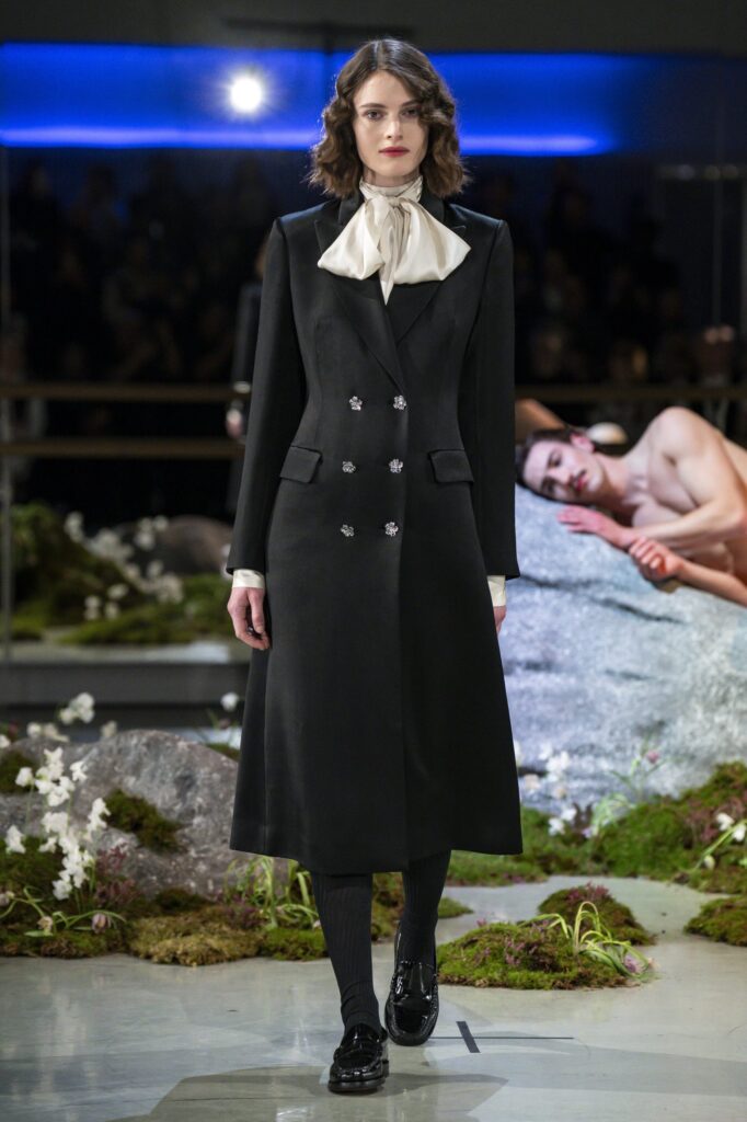 Pussy-bow blouses peeked out from beneath structured coats and tailored waistcoats, as double-breasted outerwear lent the collection a composed, cultivated polish. A thread of old Hollywood glamour ran throughout—embellished cups, masterful draping and precise sartorial sculpting conjured a bygone elegance—yet felt assuredly modern rather than nostalgic.