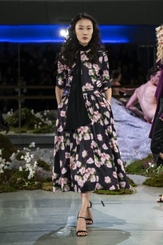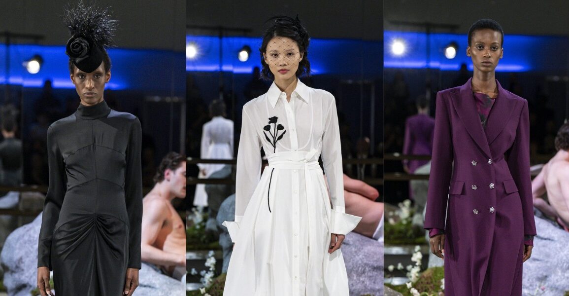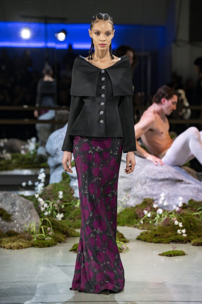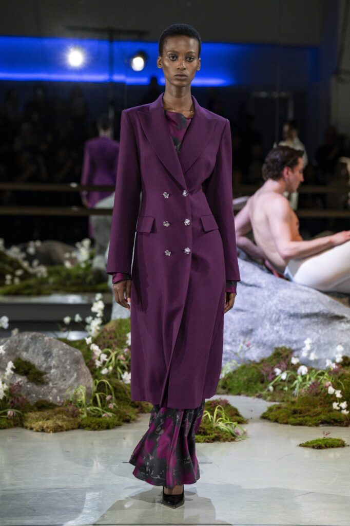Buttoned dress coats and neatly cut waistcoats anchored the softer moments. McDowell’s signature florals surfaced repeatedly, woven through sculpted dresses and sharply tailored separates, adorning a flower-strewn shirtdress and culminating in a corseted evening gown rendered in hazy purple-and-black blooms.