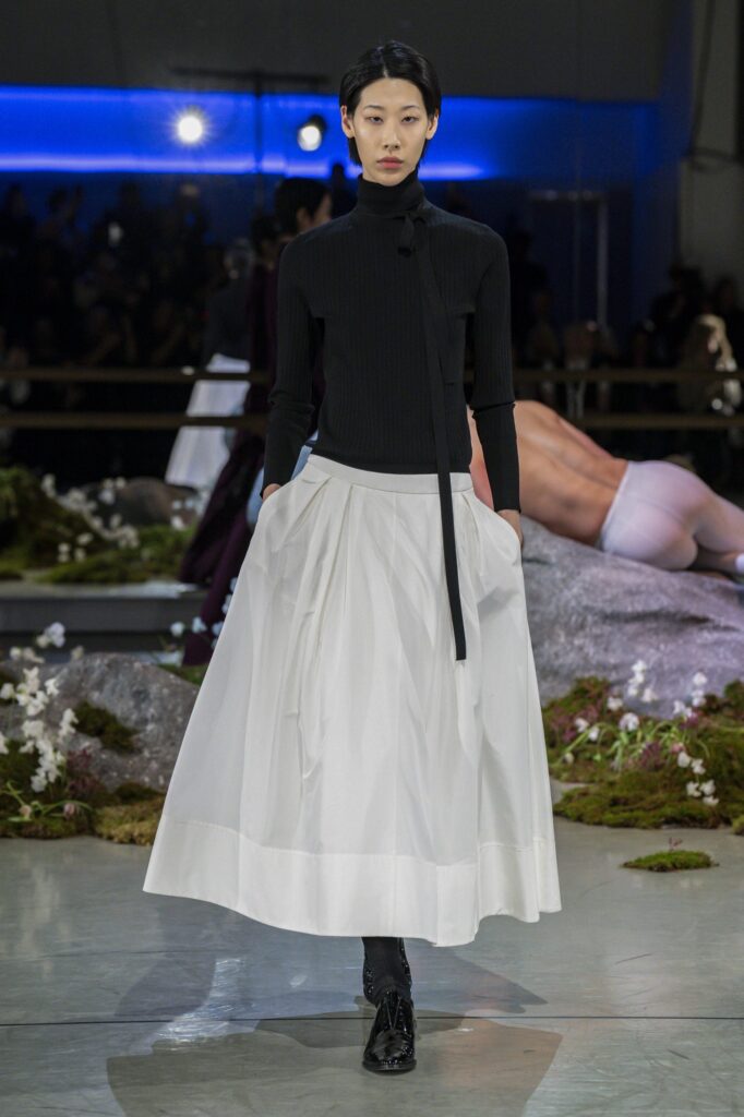 This concept was clear from the start, as the opening look showcased a voluminous white A-line skirt styled with a black ribbed knit sweater. “It felt very casual, but for me, that’s something super beautiful. I think George might have liked it too,” McDowell said.
