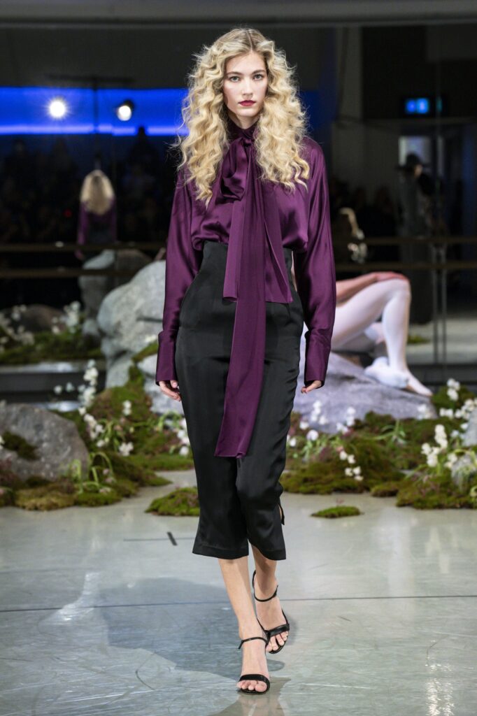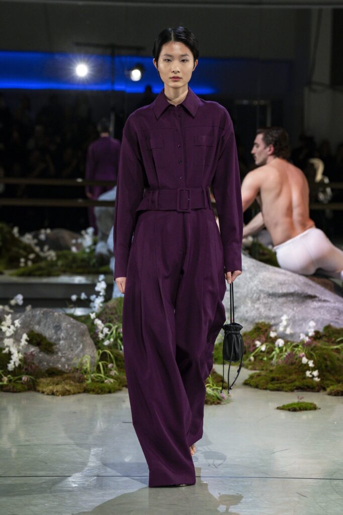 McDowell continued to emphasize the beauty of the female body with ease and sophistication through sculpted overcoats and wool jumpsuits in a gentle purple hue. Structure mingled with the designer’s signature playfulness through voluminous tulle skirts and tailored jackets with rose-shaped buttons.
