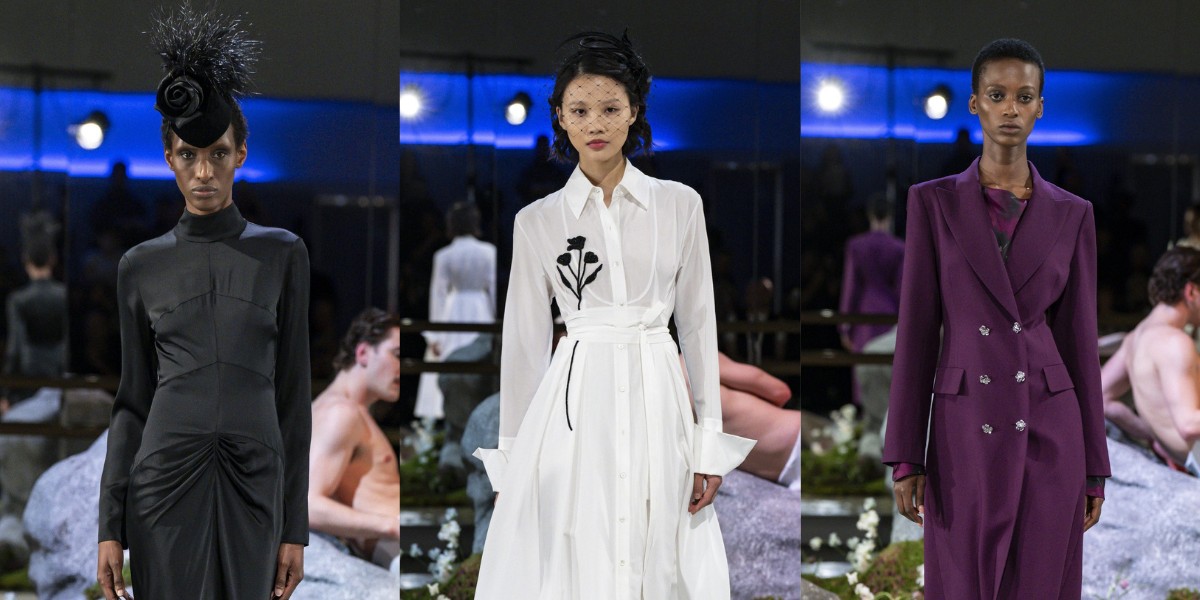 Buttoned dress coats and neatly cut waistcoats anchored the softer moments. McDowell’s signature florals surfaced repeatedly, woven through sculpted dresses and sharply tailored separates, adorning a flower-strewn shirtdress and culminating in a corseted evening gown rendered in hazy purple-and-black blooms.