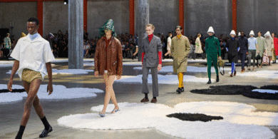 Prada’s Spring/Summer 2026 menswear show didn’t come with a set or any big theme. The show, held at Fondazione Prada’s Deposito in Milan, revealed a bare set, concrete floors, visible beams, and large windows letting in natural light. Flower-shaped carpets were the only decoration and the guests heard ambient music, birds, street noise, and cowbells instead.