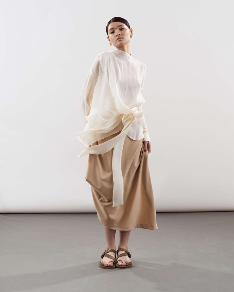 The Holiday 2025 collection captures that evolution in that it reflects romance grounded in reality. Its aesthetic is quietly architectural: asymmetrical drapes, sculpted sleeves, fabric that remembers its shape but forgives movement.
