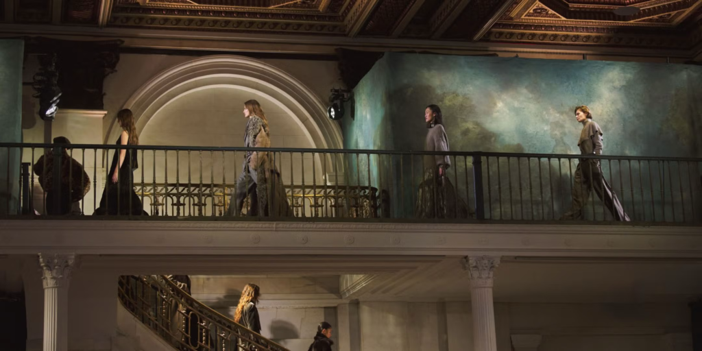 Metallic elements ran throughout the show. Silver belt chains, shimmering brooches, and jackets with a knight-like sheen gave certain looks the feeling of subtle armor. There were pieces that nodded to medieval references through chainmail-inspired textures, too. Even a plunging silk velvet evening gown with chain straps stood out requiring no additional accessories.