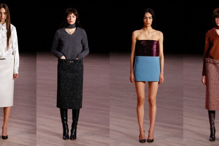 The collection opened with Gigi Hadid in a dark turtleneck layered under a brown skirt set, cinched with a silver waist chain. From there, the lineup moved through gray-toned corset blazers, velvet dresses, tailored wool coats, tweed skirt suits, and crystal brooches.