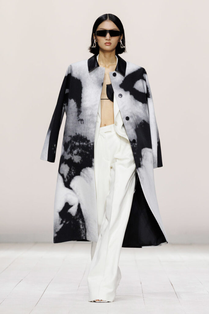 “The collection started with peeling back the structure of tailoring to reveal skin and a sense of lightness and ease,” Burton said in the show notes. That was clear from the very first look: a sharp yet soft mini suit-dress with sculptural sleeves and raw hems. Across the show, jackets were stripped of inner canvas to allow movement, and coats often slipped off the shoulder, revealing lingerie straps holding everything in place.