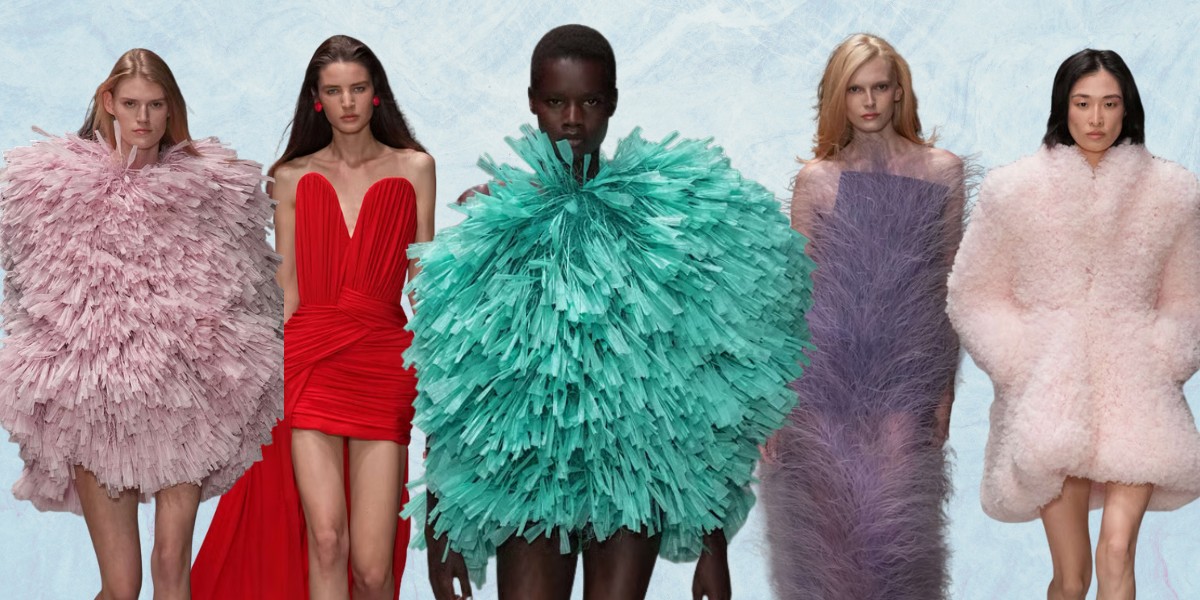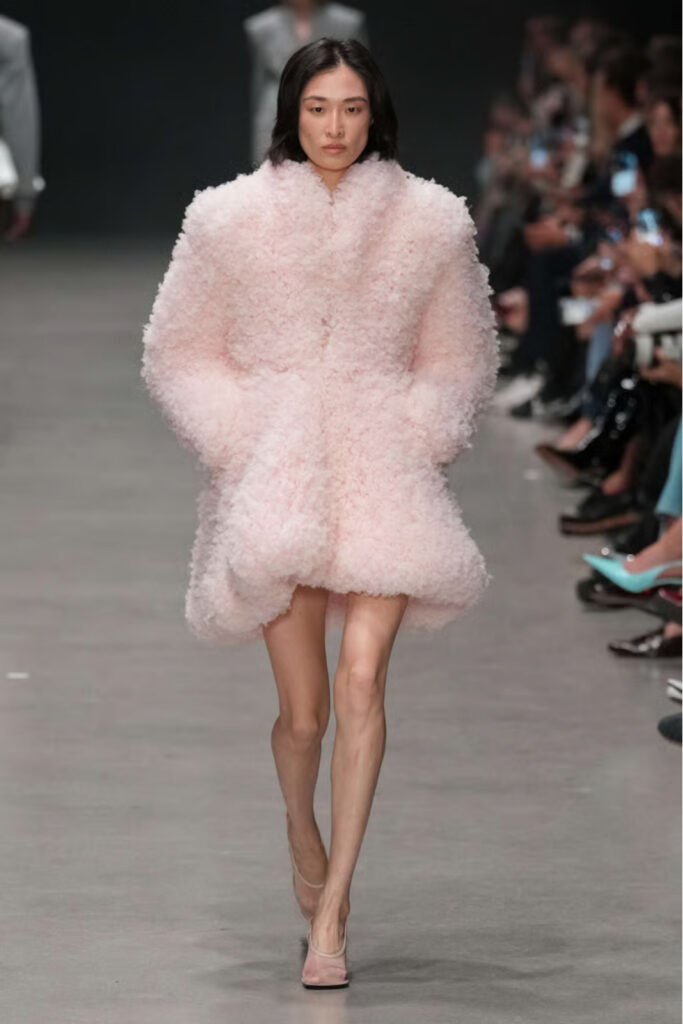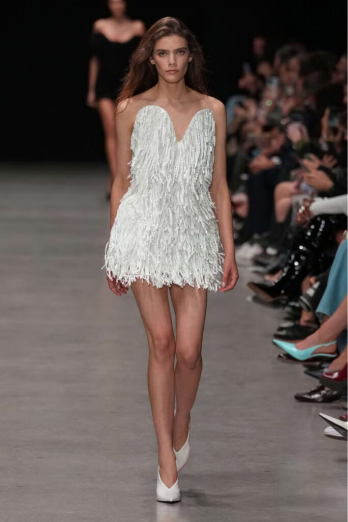 The show opened with McCartney’s interpretation of corporate dressing gone rebellious or, simply put, deconstructed workwear. Think sharp suits with exaggerated shoulders and classic double-breasted jackets sliced open at the sides or purposefully unbuttoned and undone. Snazzy big party pieces came to play. They arrived as sequined corset tops and button-downs, fuzzy oversized tops, big fluffy coats, and satin gowns in an airy feather substitute.