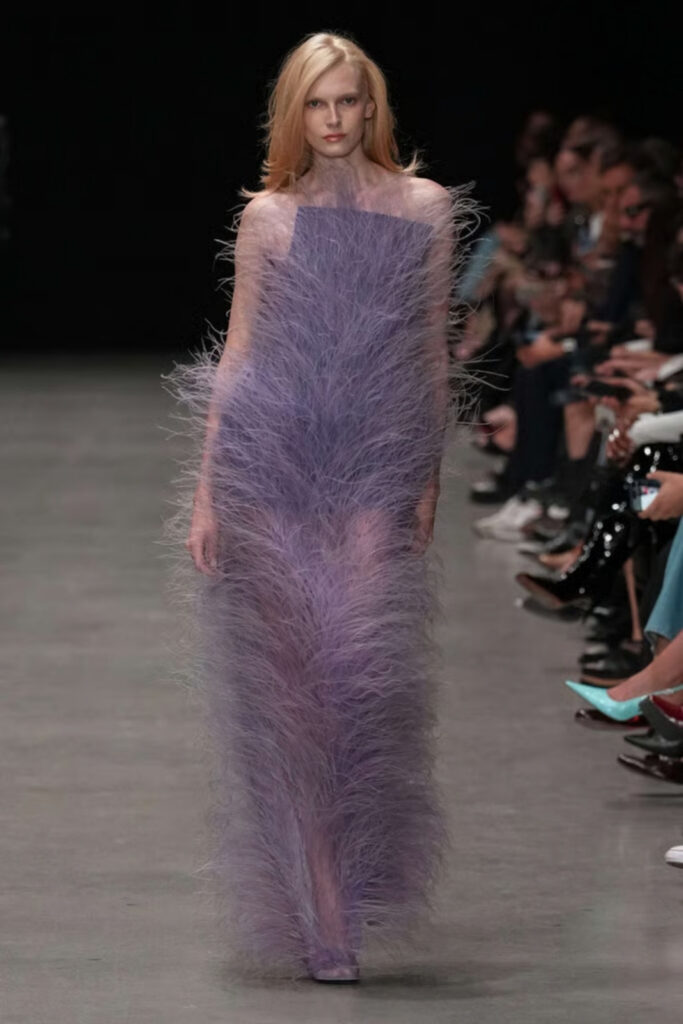 A model (above) presents a gown made from feather substiute by Stella McCartney (below). | Photos by Gonzalo Fuentes/Reuters