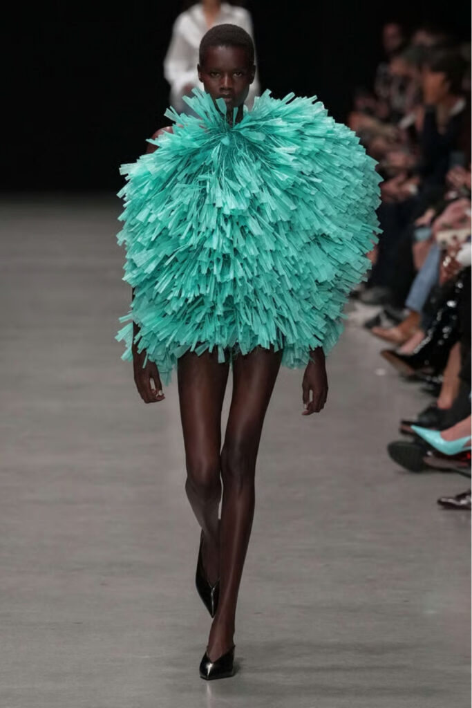 The collection showcases McCartney’s mastery of blending spectacle with sustainability. “It’s about coming together—all humanity, all Mother Earth’s creatures—now more than ever,” the designer said at the backstage of her show in Centre Pompidou on Sep 30.