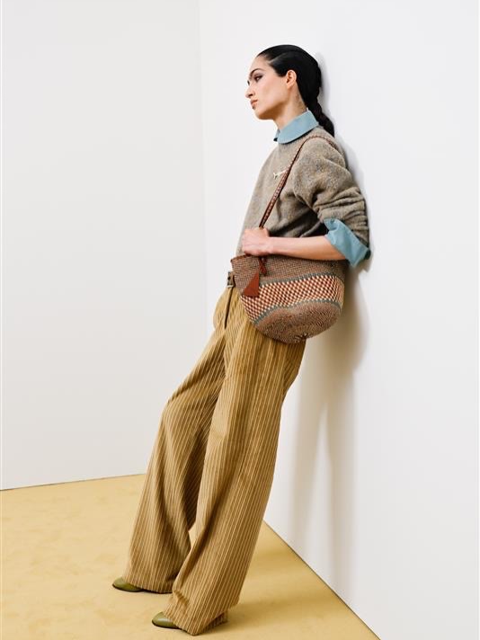 Cardigans were elevated with handmade embroidery, as corduroys got an apricot and saffron makeover—an interplay of the masculine and feminine—to suit today’s women who balance style and life on the go. Shetland wool sweaters were brushed and washed to airy softness, while drop-waist dresses got their contemporary twist in the form of ragged seams.