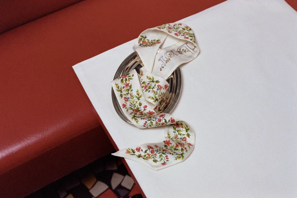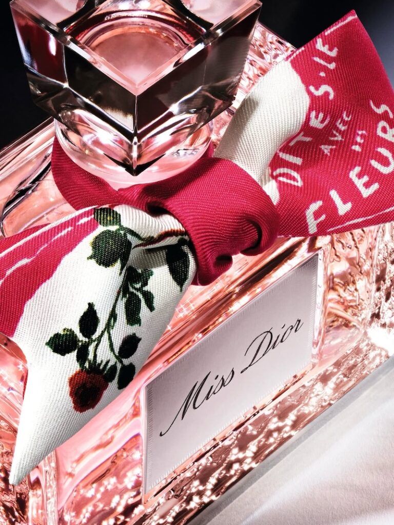 Romance and femininity extend to the rest of the collection, which includes silk scarves and Mitzahs in pastel shades and a romantic Doves & Roses pattern, as well as jewelry that is adorned with the same bucolic details. Completing the lineup is the house’s Miss Dioramour perfume, beautifully reimagined with a precious bow in Marc Bohan’s iconic 1968 ‘Dites-le avec des Fleurs’ pattern. It’s an “exceptional numbered edition” that’s sure to captivate posh fragheads.