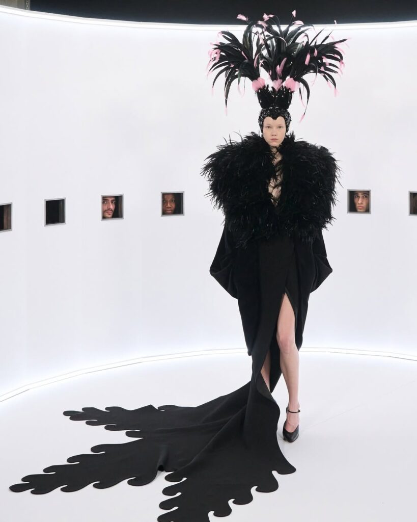 The use of the device for the show was “not as a nostalgic mention, but rather as a critical tool able to interrogate the contemporary conditions of the gaze,” Michele wrote in the show notes. He wanted to flip the gaze and invite everyone to look at fashion inwards.