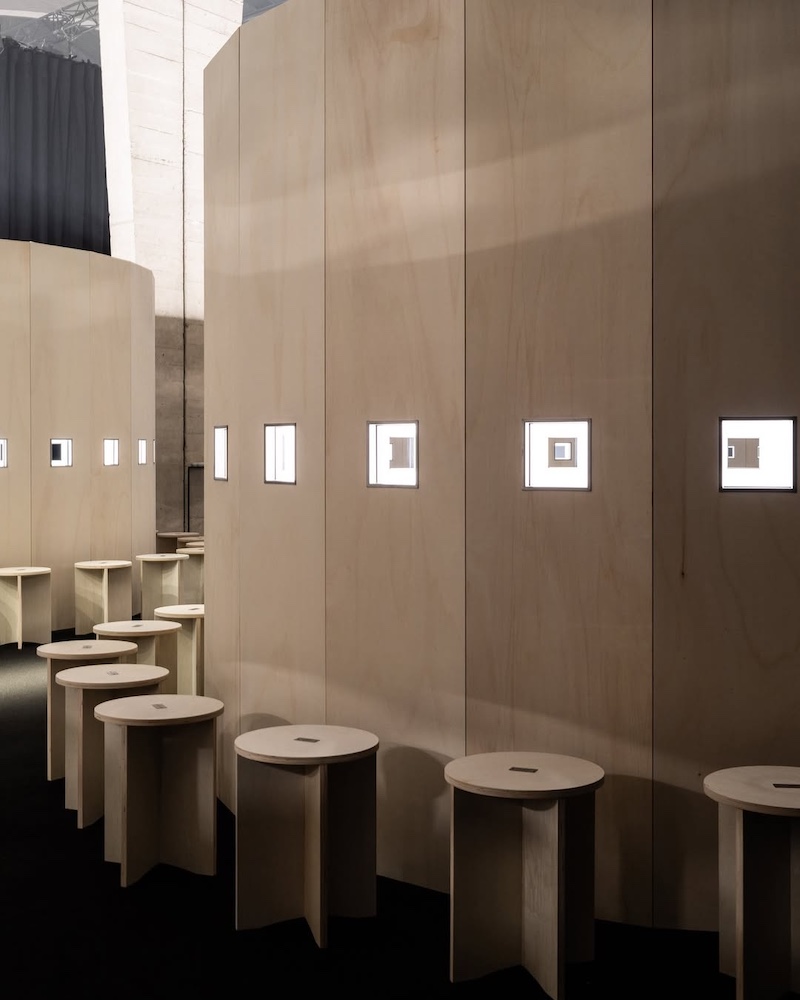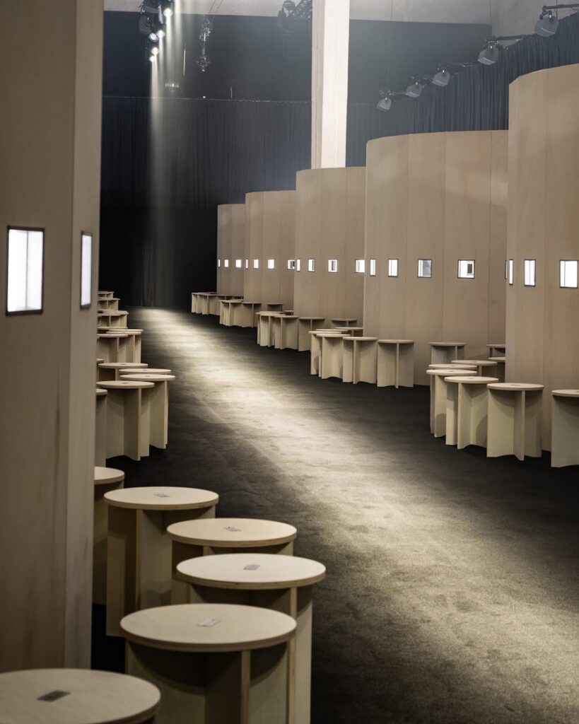 Instead of the usual runway, guest sat on stools around walled circular structures, and peered through small individual windows to see models showcasing the collection. The concept is starkly similar to the Kaiserpanorama, a 19th-century stereoscopic device by August Furhmann for viewing moving images and a precursor to the motion picture.