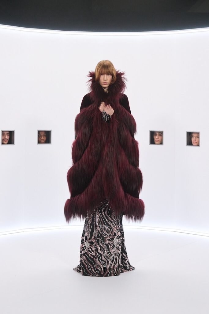 Among the standouts was a blood-red velvet dress cut with monastic severity. a trench coat made from pleated gold lame, a fur-lined robe with fluttering golden paillettes, and an ivory gown adorned with dense silver filigre.