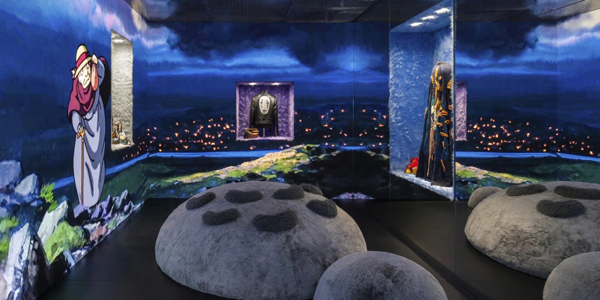 “The exhibition transports the audience from the sights and sounds of Spain, to the front row of the Paris runway, and in a series of interactive rooms, inside the visionary imagination that has inspired Loewe’s recent collections—including those of Studio Ghibli and the Kyoto-based ceramics studio Suna Fujita,” Loewe said in a release.