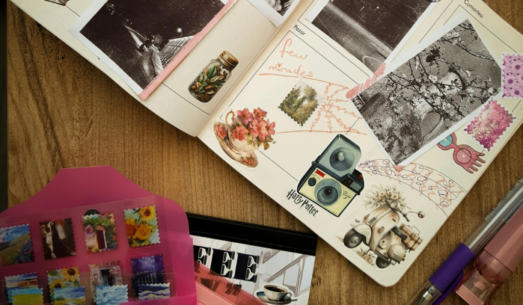 Junk journaling transforms a blank notebook into a visual vault of ideas, thoughts, and transitions, blending narratives with texture: the sketches and stickers. It allows individuals to actively document their daily encounters and deeper discoveries, with entries as proof of emotional progress and evolution.