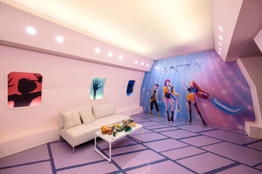 After the showroom, guests will be directed to the second floor, where they can recreate scenes from the film inside eye-popping photo op stations. Similar to the film, the first zone takes you to the HUNTR/X’s private jet, where the trio slays demons in the beat of How It’s Done.