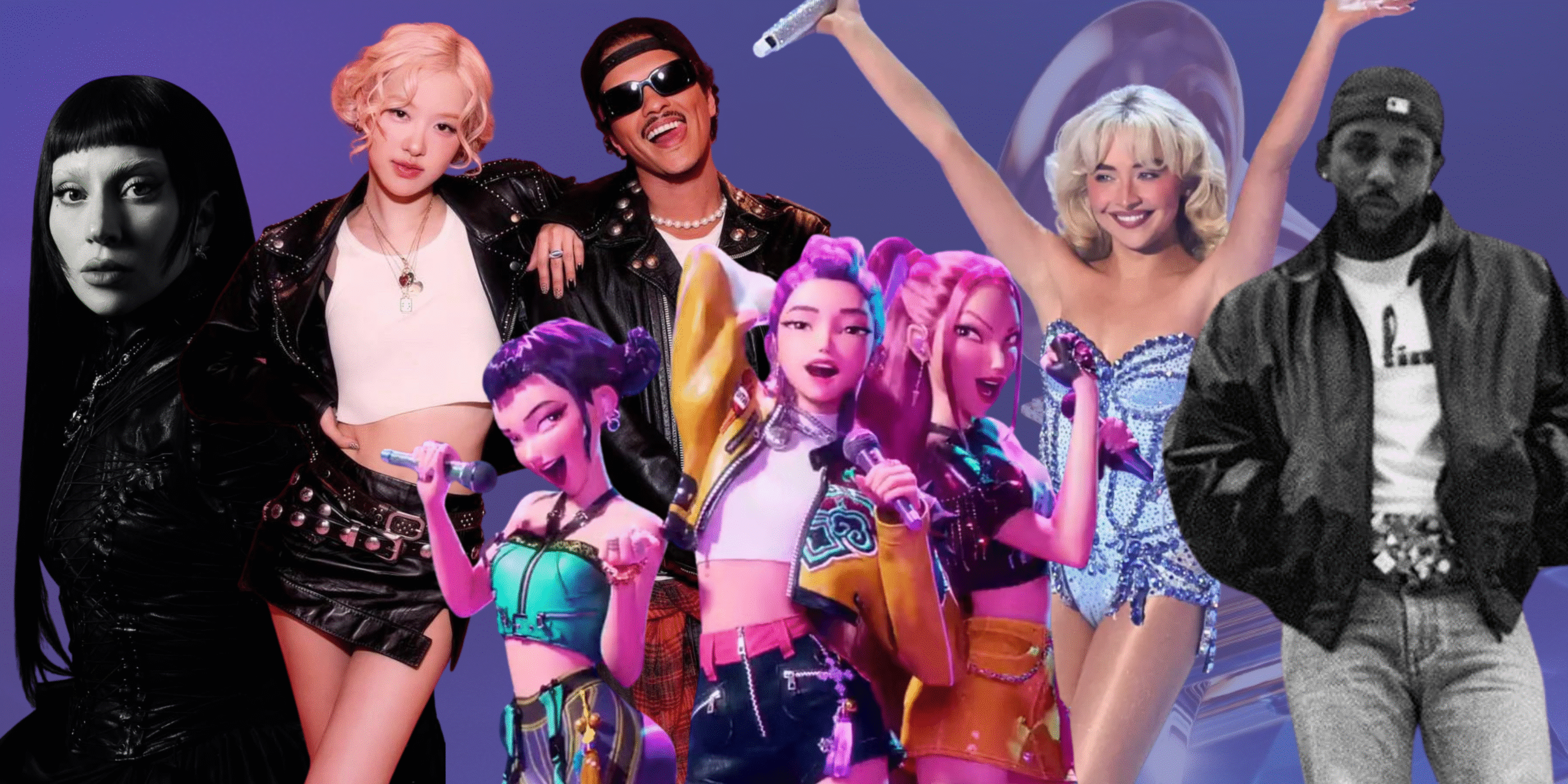Kendrick leads with nine, Lady Gaga follows with seven, and K-pop and Latin pop notch high.