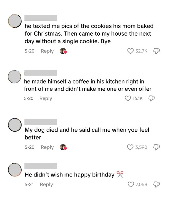 Based on the thousands of comments on the viral video, this content creator isn’t the only one practicing a cut-them-off-with-no-regrets mindset when looking for a partner. One user wrote, “He texted me pics of the cookies his mom baked for Christmas. Then came to my house the next day without a cookie. Bye.”