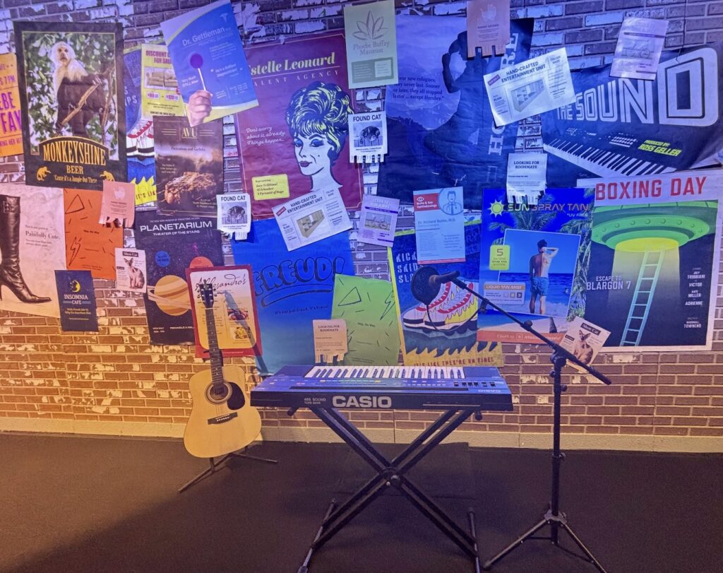 Right outside Central Perk, a busking station is set up with both Phoebe’s guitar and Ross’ keyboard, but more interesting are the ads plastered on the brick wall, including one of Monkeyshine Beer, featuring Ross’ former pet capuchin monkey Marcel, who rose to stardom after a break-in at the San Diego Zoo. Other ads feature Phoebe’s masseuse services; Burke & Son Opthalmology; restaurants Allesandro’s and Javu, Phoebe’s cat with “maternal instincts,” a hairless show cat; Estelle Leonard Talent Agency; 5 second spray tan services; the off-Broadway plays Boxing Day and Freud!; a handcrafted entertainment unit for sale; Hombre perfume; and more!