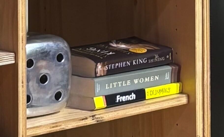 Lots of little details over at the boys’ apartment, including the oversized entertainment unit that Joey built himself, the vintage monochrome Laurel and Hardy poster, the Three Stooges statues, even Hugsy the penguin. But Joey’s book stack stands out, with three titles: Stephen King’s The Shining, Louisa May Alcott’s Little Women, and French for Dummies—IYKYK!