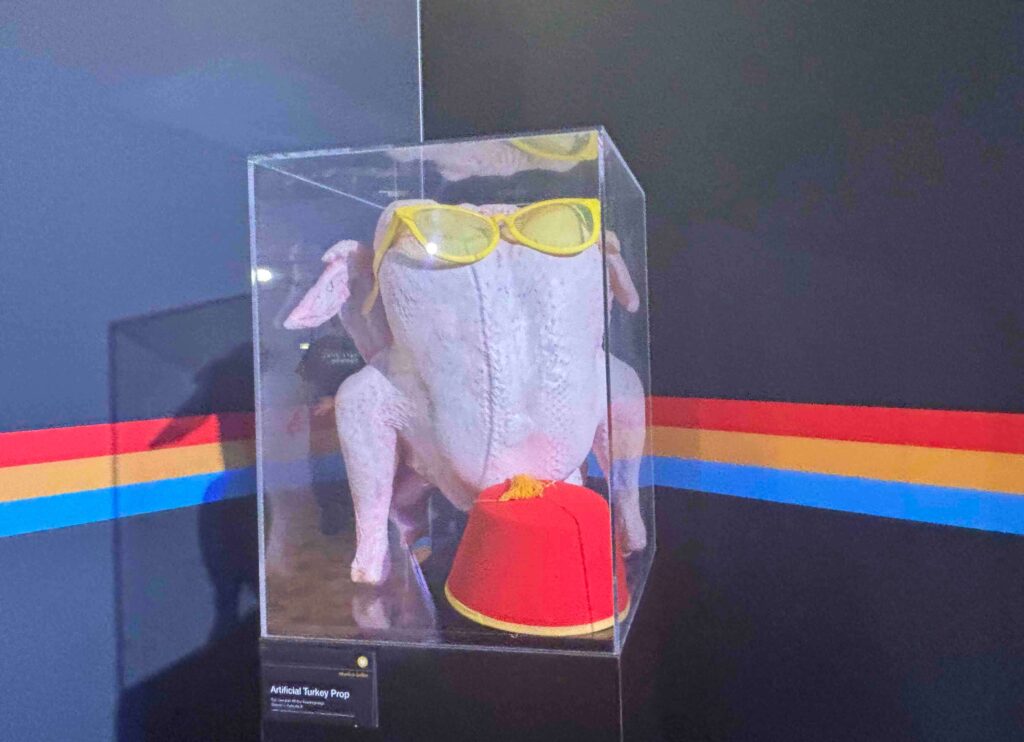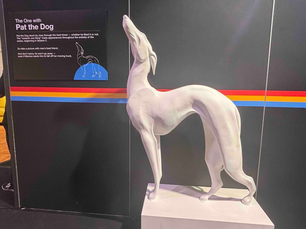The big, white porcelain dog was Joey’s prized possession, bought when he first landed a role on Days of Our Lives, and the only thing that got saved from repossession once he was fired from the show (thanks to Ross, who bought it back for him). The dog originally belonged to Jennifer Aniston, who loaned it to the show. Other notable props on display include the turkey (with fez and glasses) from the episode “The One With All the Thanksgivings,” and a standee of all of Chandler’s clothes, as worn by Joey in retaliation to Chandler hiding his underwear in “The One Where No One’s Ready.”