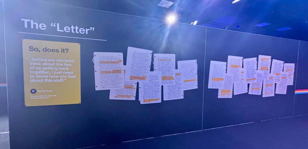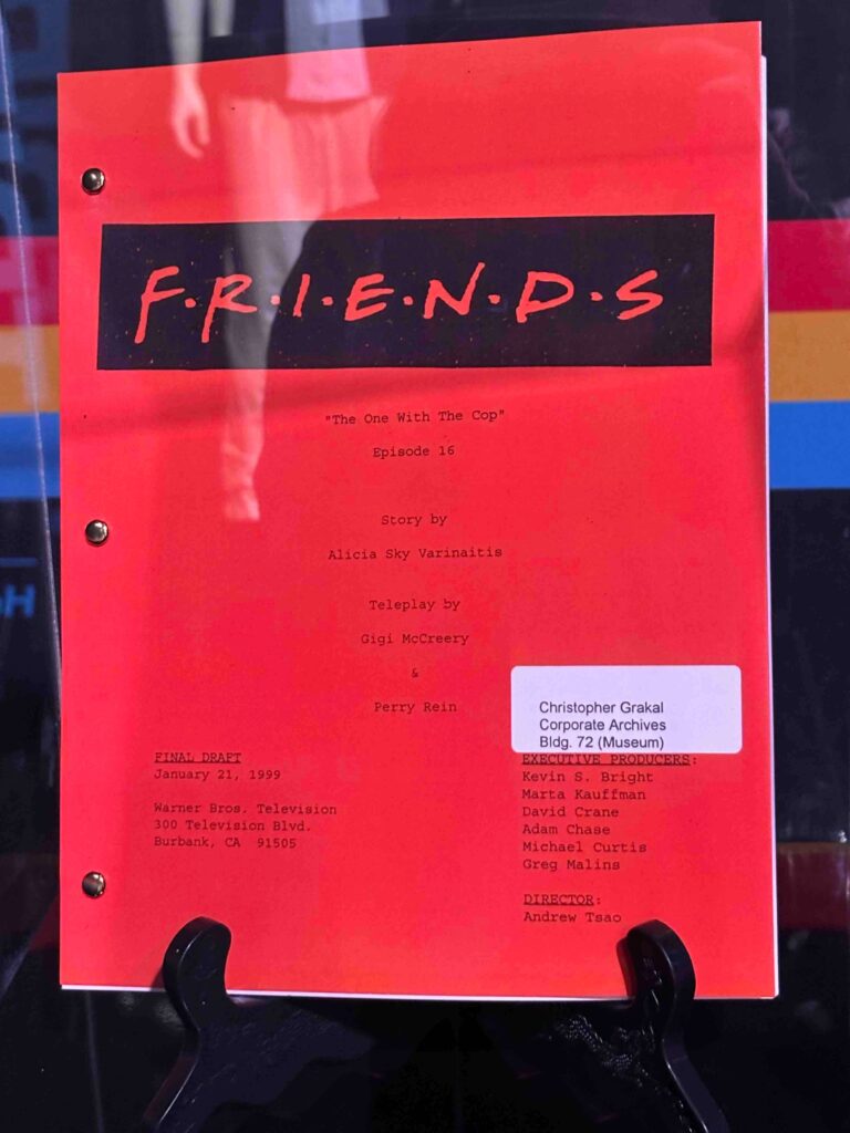 One of the items on display is a signed copy of the pilot script, with the working title “Six of One,” before it was finalized to simply Friends. Two other scripts are on display, “The One Hundredth” (aka “The One With the Triplets”), where Phoebe gives birth to her brother’s babies; and “The One With the Cop” (the episode with the “Pivot!” scene), both from season 5.