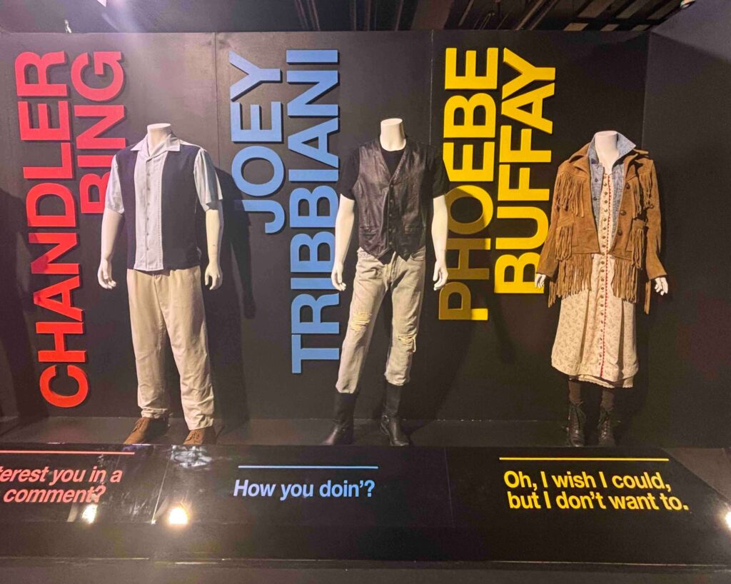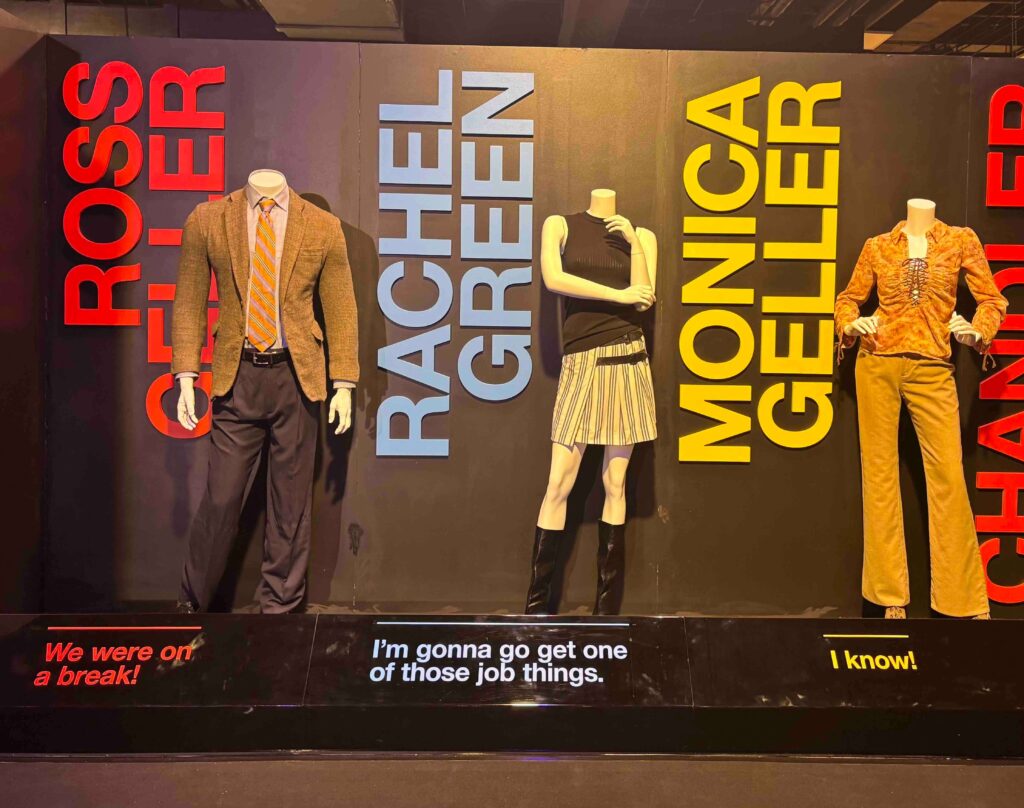 On exhibit are sketches of the cast by costume designer Debra McGuire, as well as a capsule wardrobe collection showcasing each of the characters’ distinct styles: Ross’ tweed coat, checked shirt, and striped tie; Rachel’s ribbed tank top, miniskirt and tall boots; Monica’s 90’s vintage; Chandler’s bowling shirt and chinos; Joey’s head-shot worthy leather vest, ripped jeans and biker boots; and Phoebe’s boho busking garb – not like you’ll need the names to identify which character rocked which outfit!