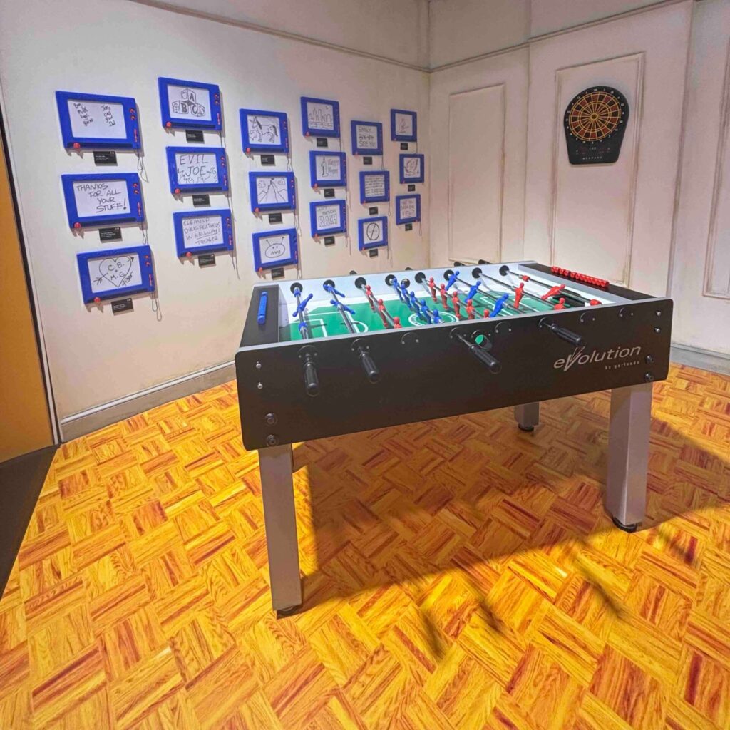 There’s a magnificent display of Magna Doodle boards representing the one that hangs on the door of the boys’ kitchen, featuring various doodles from different episodes, including a note from Treeger to clean up the duck feathers in the hallway; “Have you seen our view?” left by the boys when they won the girls’ apartment; and “I’m Sorry” ad infinitum from when Chandler kissed Joey’s girlfriend Kathy.