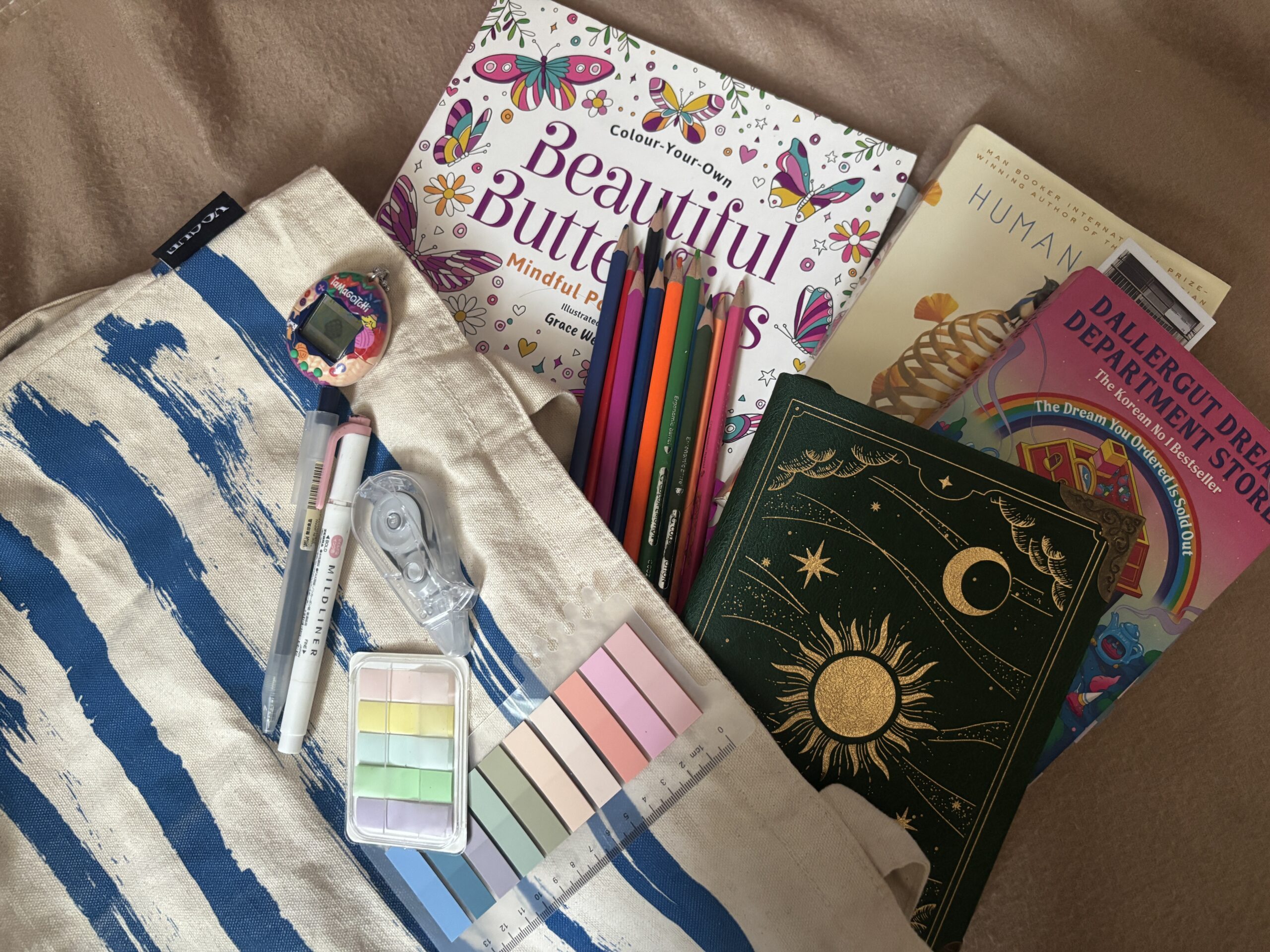 A tote filled with books, journals, pens, and small offline hobbies has become one of the most relatable wellness habits right now.