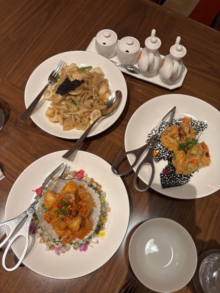 That evening at Red Lantern, Solaire’s Chinese restaurant, we went full comfort mode — tobiko and shrimp rice, seafood noodles, salt and pepper squid, salted egg tiger prawns, baked honey BBQ buns. We ate well, took a long bath, and went to bed completely ready for concert day.