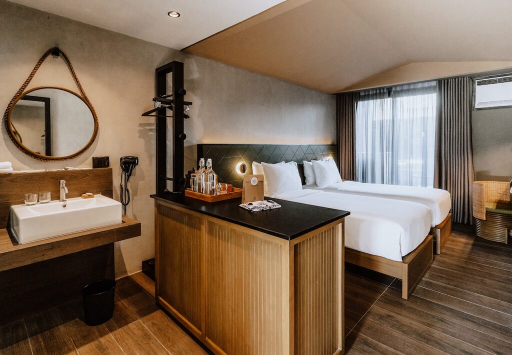 The rough and rustic finishes of the low dining tables, the navy green bedroom headboards, the concrete hallways, the openness of the 27-sqm. rooms—all these add to the homey and mellow vibe the hotel promotes and exudes. As the name suggests, it doesn’t take things too seriously. There’s a cool comfort that makes it inviting.